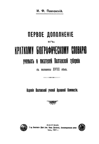 Павловский И. Ф.ПЕРВОЕ ДОПОЛНЕНИЕ К КРАТКОМУ БИОГРАФИЧЕСКОМУ СЛОВАРЮ УЧЕНЫХ И ПИСАТЕЛЕЙ ПОЛТАВСКОЙ ГУБЕРНИИ С ПОЛОВИНЫ XVIII ВЕКА (1913)