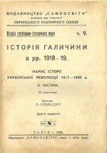 Опис документа: Історія Галичини в рр. 1918-19. - Львів : Самоосвіта. - (Відділ суспільно-історичних наук ; ч. 9) Слободич, О. Ч. ІІІ : Нарис історії Української революції 1917-1920 р. / О. Слободич. – 2-е вид. – 1935. – 40 c.