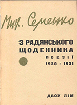 Опис документа: Семенко, Михайль. З радянського щоденника : поезії (1930-1931) / Мих. Семенко, худож. Я. Леус. – Харків: Література і мистецтво, 1932. – 90 c. Відсутні: с. 22-23.