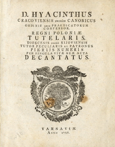 Опис документа: Minasowicz, Józef Epifani (1718–1796). D. Hyacinthus Cracoviensis primum Canonicus Ordinis dein Praedicatorum Confessor. Regni Poloniae Tutelaris. Dioecesis porro Kijoviensis Tutor Peculiaris et Patronus. Pierijs Numeris Per Singula Vitae Suae Acta Decantatus / Minasowicz, Jуzef Epifani . – Varsaviae [Warszawa]: [s. n.], 1786. – [8] f.; 4° 193х160 мм. |