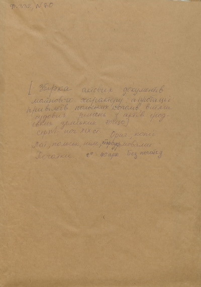 Відомості про історію фонду: - Фонд № 332 сформовано з кількох документальних масивів, насамперед, скасованих духовних установ. Зокрема, у 1935 р. архів та рукописні книги Коростишівського, Новоградволинського костелів було прийнято згідно з актом від 26 червня 1935 р. співробітником бібліотеки ВУАН М.З. Суслопаровим, 25 березня 1936 р. з відділу стародруків ції рукописи були передані до відділу рукописів ВБУ. Відповідно до акта, з 29 лютого по 17 травня 1936 р. С.Г. Лазоверт, директор Інституту польської пролетарської культури здав масив рукописів, які прийняв співробітник Бібліотеки С.А. Назаревський. Серед них – витяги з гродських, земських, актових, трибунальських книг, літературні твори та навчальні курси. Земельно-майнові, економічні та родові матеріали фонду надійшли у 1955 р. з Інституту економіки НАН України, ймовірно, у складі загального масиву документів.